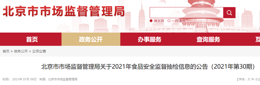 北京市市場(chǎng)監(jiān)督管理局關(guān)于2021年食品安全監(jiān)督抽檢信息的公告(2021年第30期)