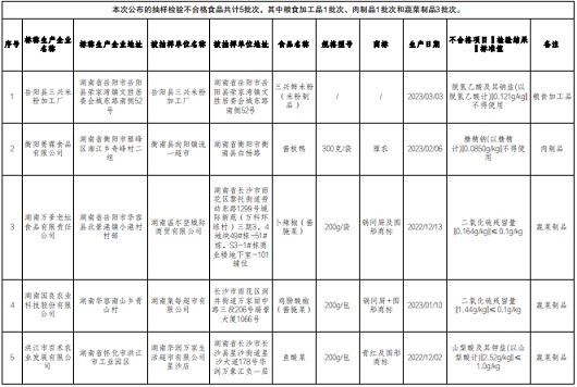 抽檢信息顯示,這5批不合格食品包括1批次糧食加工品、1批次肉制品和3批次蔬菜制品,均檢出食品添加劑問題,分別為標(biāo)稱岳陽縣三興米粉加工廠生產(chǎn)的三興鮮米粉(米粉制品),脫氫乙酸及其鈉鹽(以脫氫乙酸計)項目不符合食品安全國家標(biāo)準(zhǔn)規(guī)定;衡南縣向陽鎮(zhèn)流一超市銷售的,標(biāo)稱衡陽菁霖食品有限公司生產(chǎn)的醬板鴨,糖精鈉(以糖精計)項目不符合食品安全國家標(biāo)準(zhǔn)規(guī)定;湖南溫爾登城際商貿(mào)有限公司銷售的,標(biāo)稱湖南萬爹老壇食品有限責(zé)任公司生產(chǎn)的卜辣椒(醬腌菜),二氧化硫殘留量不符合食品安全國家標(biāo)準(zhǔn)規(guī)定;湖南集每超市有限公司銷售的,標(biāo)稱湖南國良農(nóng)業(yè)科技股份有限公司生產(chǎn)的雞腸酸椒(醬腌菜),二氧化硫殘留量不符合食品安全國家標(biāo)準(zhǔn)規(guī)定;湖南華潤萬家生活超市有限公司星沙店銷售的,標(biāo)稱洪江市百禾農(nóng)業(yè)發(fā)展有限公司生產(chǎn)的魚酸菜,山梨酸及其鉀鹽(以山梨酸計)項目不符合食品安全國家標(biāo)準(zhǔn)規(guī)定。